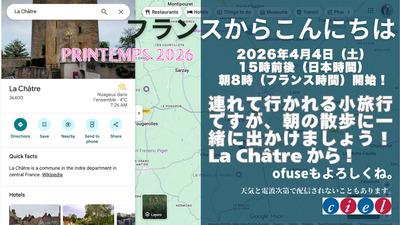 フランスからこんにちは 2026年4月4日(土) 15時前後(日本時間) 朝8時(フランス時間)開始! 連れて行かれる小旅行ですが、朝の散歩に一緒に出かけましょう! La Châtre から!