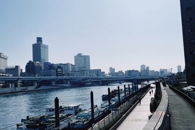 都会のオアシス、浮かぶ船とビル群