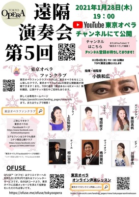 曲目 聖歌「世の人忘るな」 全員 モーツァルト「ねえあなた 良い子にしてるなら」 ソプラノ:原 夏美 全集中 歌の呼吸で 演奏会 ロッシーニ「約束」 メゾソプラノ:松本やすこ 画面越し あなたに贈る 愛の歌 チレア「私は創造の神のしもべ」 ソプラノ:増田紋子 サンタさん 一緒にいかが? 麦の泡 ヴィヴァルディ「冬・第2楽章」 弦楽:嶋田雄紀 飾りつけ 鼻歌まじる クリスマス モーツァルト「わが心を贈ります」 メゾソプラノ:松本やすこ 遠隔でも 心は蜜に 二重唱♥️ バリトン:岩田健志 プッチーニ「冷たい手」 テノール:相山潤平 木枯らしに 凍えし頬へ 愛の唄 ビゼー「闘牛士の唄」 バリトン:岩田健志 冬の夜 夜空の星と 音楽会 ヴェルディ「椿姫・乾杯の歌」 全員 ピアノ伴奏:川端夢衣 冬の夜 おうちで楽しむ プチ贅沢 総監督:小鉄和広 YouTube 観ても撮っても 酔いかげん