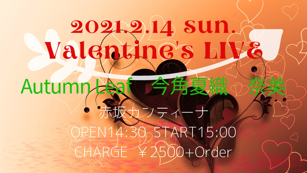 緊急事態宣言が3/7まで延長されましたね。。 次ライブは時間帯を早めての開催です。 有客ですが、人数制限もありますので お越しの際は必ずご一報くださいね! このご時世なので、不安な方や体調がすぐれない方は無理なさいませぬように。。 元気な方、お待ちしております! 当日はバレンタインデーなので、 「ショコラ」っていう短い曲を初お披露目したいと思います🎵 赤坂から愛を❤️ 2021.2.14(日) 赤坂カンティーナ Open14:30 / Start15:00 Charge ¥2500+order w)今角夏織、Autumnleaf
