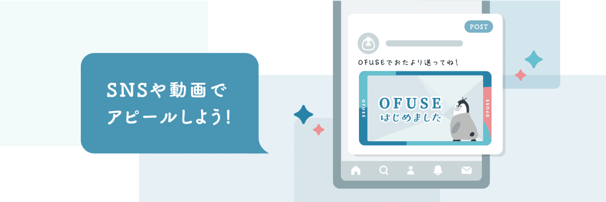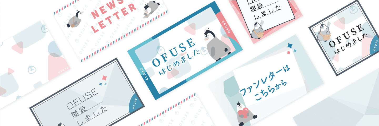 OFUSEのロゴ・アイコンやマスコットキャラクターのイラスト、告知画像用のコラージュ素材など、さまざまなアイテムをダウンロードして、ご自身の活動アピールにご利用いただけます。